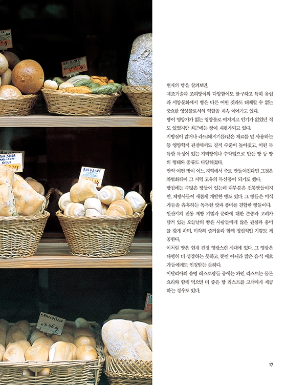 아침 식사용 빵, 식전주와 함께 먹는 빵, 전채요리와 함께 먹는 빵, 디저트와 빵 같이 빵을 용도별로 보기 쉽게 분류하여 소개했습니다. 아울러 각각의 빵에 어울리는 이탈리아 요리도 함께 실어 활용도를 높였습니다.