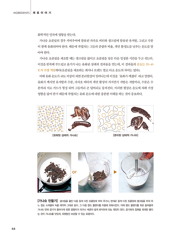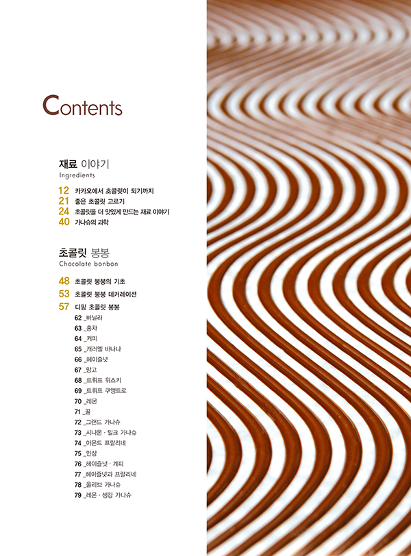 카카오가 초콜릿이 되기까지의 자세한 설명은 한걸음 더 초콜릿을 이해할 수 있게 한다. 재료를 충분히 알고 있는 것이 좋은 제품을 만들기 위한 초석이라고 생각한 저자는 초콜릿 뿐 아니라 감미료, 물과 같은 기초재료와 초콜릿에 맛을 더해주는 스파이스, 알코올등과 초콜릿과의 어울림을 상세히 설명하고 있다.