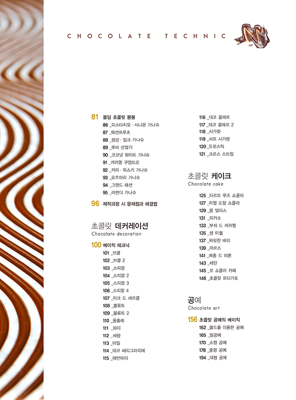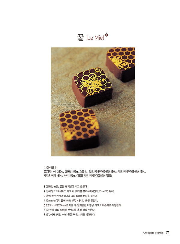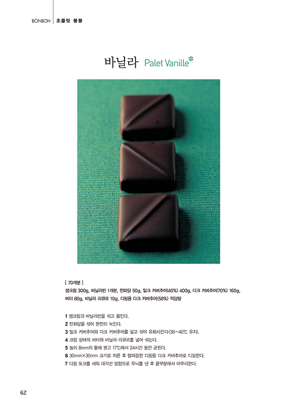 초콜릿의 작은 보석이라 불리는 초콜릿 봉봉을 디핑 초콜릿봉봉과 몰딩 초콜릿 봉봉으로 나눠 이론을 자세히 설명하고 28종의 레시피를 소개했다. 또한, 디핑과 몰딩 작업과정에서 발생할 수 있는 문제점을 보여주고 그 해결책을 제시한다.