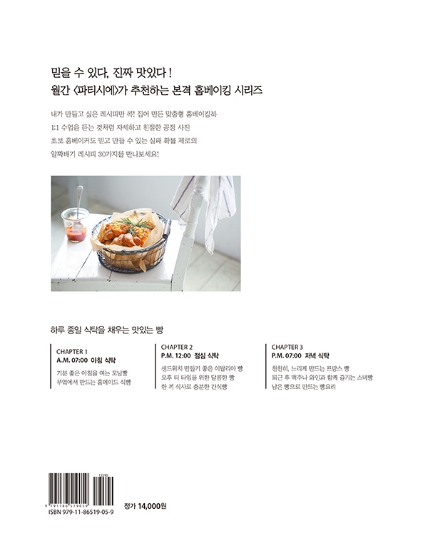 저자 윤문주 오너 셰프(블랑제리 11-17, 르 봉 마리아쥬)는 스물아홉 여름, 윤문주 셰프는 성내동 11-17번지에 동네 빵집을 열었다. 작은 골목길에 자리한 이곳까지 사람들이 찾아오길 바라며 번지수를 가게 이름으로 지었다. 번지수를 제 이마에 붙이고 사람들을 기다렸던 작은 빵집이 지금은 빵 마니아들이 꼭 들러야 하는 ‘성지’가 되었다. ‘순례’하듯 먼 길을 가야 하지만, 한번 맛을 보면 꼭 다시 찾아 가게 된다는 ‘블랑제리 11-17’. 그는 김영모 제과점에서 근무하다 더 넓은 시야를 갖기 위해 미국으로 떠나 C.I.A에서 연수를 받으며 넓은 시야를 갖게 되었지만, 오히려 한국인의 입맛에 맞는 제품을 더욱 고민하게 되었다. 한국에 돌아온 후에는 본누벨 제과점에서 내공을 쌓으며, 한국인이 ‘주식’처럼 즐겨 먹을 수 있는 빵에 대한 연구를 멈추지 않았다. 덕분에 블랑제리 11-17의 모든 빵은 12~48시간 동안 저온 숙성되어 깊은 풍미와 식감을 자랑한다. 특히, 하드 계열의 건강빵은 윤문주 셰프의 노력이 고스란히 녹아 있는 만큼 더욱 인기가 높다. 딱딱한 건강빵이 부담스러운 사람들을 위해 쫄깃한 식감과 담백하면서도 고소한 맛을 살리는 데 주안점을 두었다. 건강빵을 찾는 사람이 더욱 늘어났으면 한다는 윤문주 셰프는, 집밥처럼 건강하게 먹는 빵에 대해 늘 고민하고 있다.
