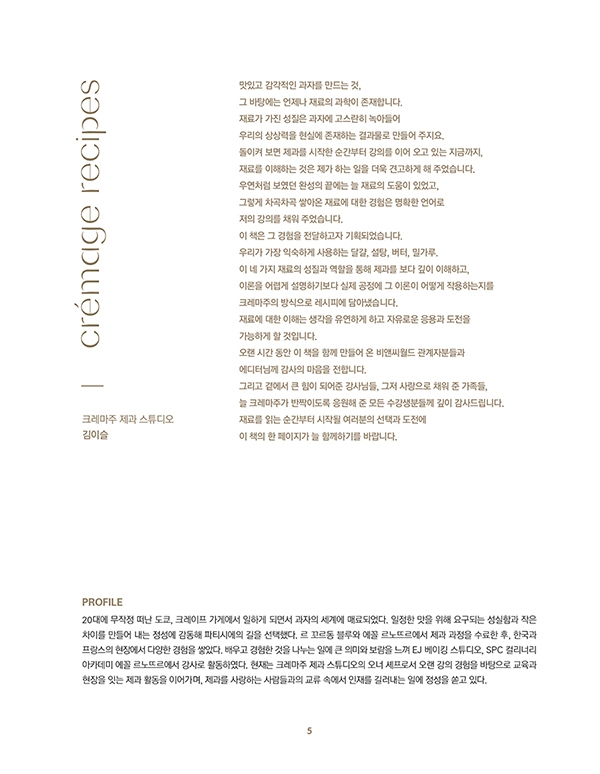20대에 무작정 떠난 도쿄, 크레이프 가게에서 일하게 되면서 과자의 세계에 매료되었다. 일정한 맛을 위해 요구되는 성실함과 작은 차이를 만들어 내는 정성에 감동해 파티시에의 길을 선택했다. 르 꼬르동 블루와 에꼴 르노뜨르에서 제과 과정을 수료한 후, 한국과 프랑스의 현장에서 다양한 경험을 쌓았다. 배우고 경험한 것을 나누는 일에 큰 의미와 보람을 느껴 EJ 베이킹 스튜디오, SPC 컬리너리 아카데미 에꼴 르노뜨르에서 강사로 활동하였다. 현재는 크레마주 제과 스튜디오의 오너 셰프로서 오랜 강의 경험을 바탕으로 교육과 현장을 잇는 제과 활동을 이어가며, 제과를 사랑하는 사람들과의 교류 속에서 인재를 길러내는 일에 정성을 쏟고 있다.