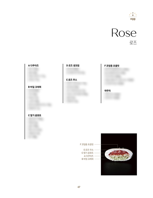 분명 같은 재료로 만드는데 왜 결과는 전혀 다른 것일까? 그 해답을 찾기 위해 이 책은 제과의 출발점이라 할 수 있는 달걀, 설탕, 버터, 밀가루, 네 가지 주재료를 탐구하는 것으로부터 시작한다. 과자 전반의 텍스처를 결정짓는 달걀, 달콤함 이상의 역할을 하는 설탕, 맛과 식감을 좌우하는 버터, 그리고 구조와 결을 만드는 밀가루 등 각 재료가 가진 특성이 각각의 단계에서 어떻게 기능하여 시그니처 제품으로 완성되는지를 생생하게 보여 준다. 이를 통해 독자는 ‘왜 순서를 지켜 작업해야 하는지’, ‘어떤 상태가 기준이 되는지’를 공정 사진을 통해 직접 눈으로 확인할 수 있으며, 재료에 대한 깊은 이해를 바탕으로 보다 자유로운 응용이 가능하다. 또한 『재료로 시작하는 크레마주 레시피』에는 그동안 <크레마주 제과 스튜디오>의 프라이빗 클래스 외 어디에서도 공개한 바 없는 크레마주 시그니처 레시피와 완벽함을 추구하는 김이슬 셰프의 생생한 팁이 가득 실려 있다. 따라서 제과 전문가라면 누구나 궁금했을 크레마주의 감각적인 디자인과 놀라운 구성의 디저트를 경험할 소중한 기회가 될 것이다.