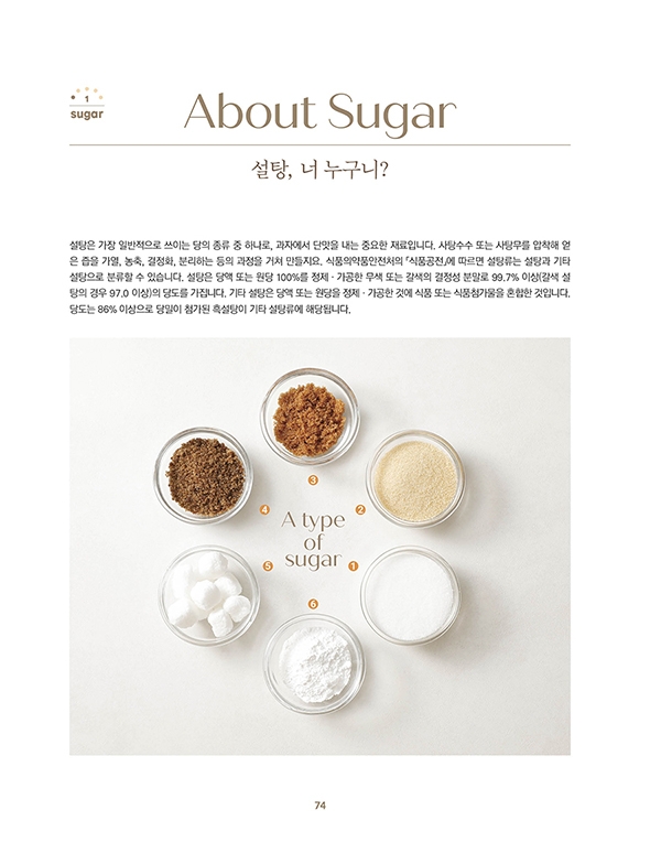 About Sugar 설탕, 너 누구니? / 자연에서 온 하얀 결정 / Character 물을 좋아하는 설탕 / 달콤한 반짝임, 결정화 / 달콤한 색을 만드는 두 가지 반응: 캐러멜화와 메일라드 반응 / 단맛 그 너머: 제과에 꼭 필요한 설탕