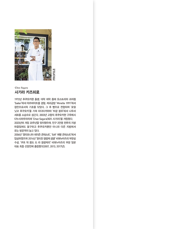 1972년 후쿠오카현 출생. 대학 재학 중에 오스트리아 과자점 ‘Sailer’에서 아르바이트를 경험. 제과공방 ‘Mireille 1991’에서 장인으로서의 기초를 닦았다. 그 후 빵으로 전향하여 ‘호텔 닛코 후쿠오카’를 거쳐 히다타카야마 ‘트랑 블루’에서 나루세 셰프를 스승으로 섬긴다. 2003년 고향의 후쿠오카현 구루메시 다누시마루마치에 ‘Chez Sagara(쉐즈 사가라)’를 개업했다. 2023년에 개업 20주년을 맞이했으며, 인구 2만명 전후의 지방마을임에도 불구하고 후쿠오카뿐만 아니라 다른 지방에서 오는 방문객이 늘고 있다. 2006년 ‘캘리포니아 레이즌 콘테스트’, ‘SAF 제빵 콘테스트’에서 입상하였으며 2014년 ‘알티잔 블랑제 콩쿨’ 비에누아즈리 부문상 수상, ‘쿠프 뒤 몽드 드 라 블랑제리’ 비에누아즈리 부분 일본 대표 최종 선발전에 출장했다(2007, 2013, 2017년).