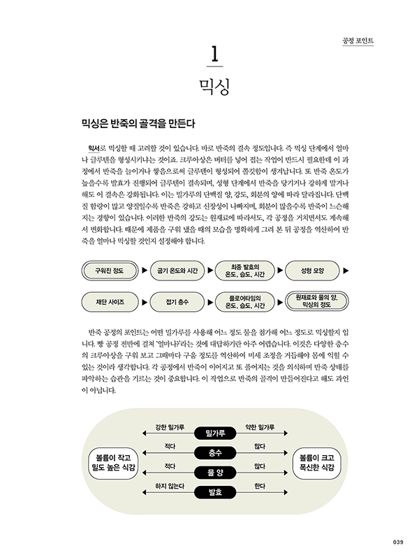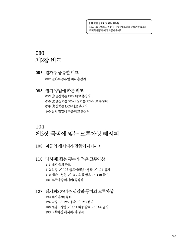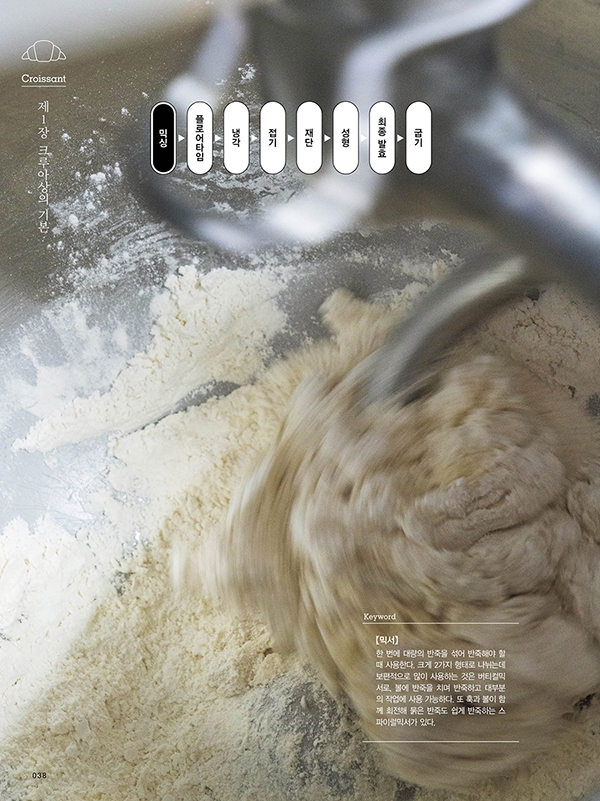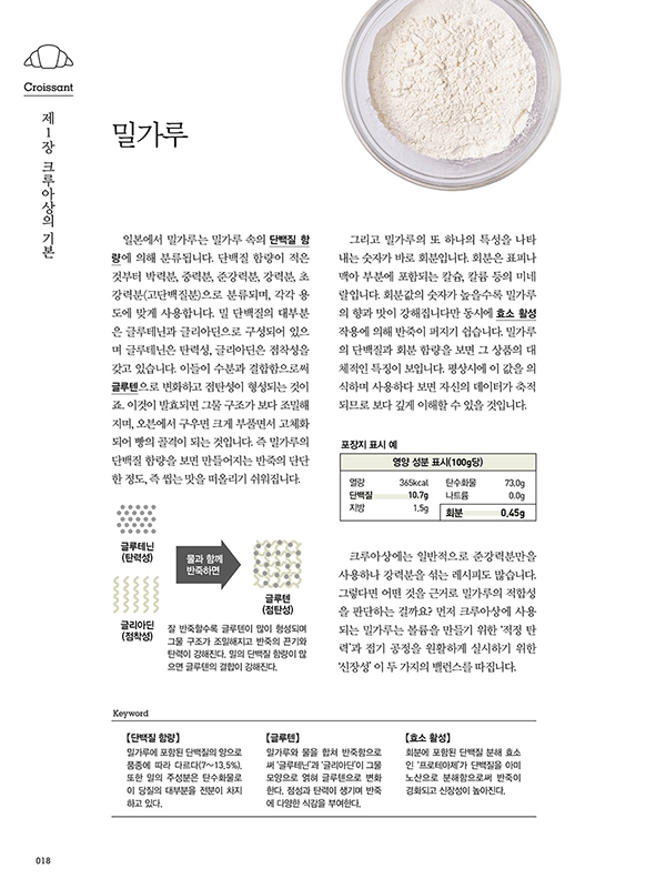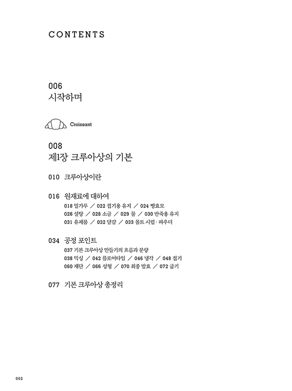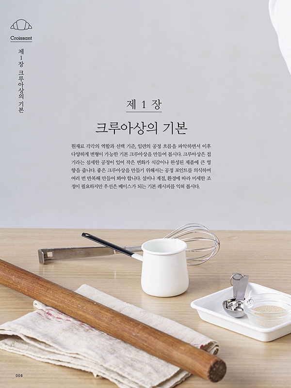 밀가루, 버터, 이스트, 설탕 등 크루아상 기본 재료들의 역할과 브랜드별 특징 및 선택 기준을 자세히 설명하고, 공정을 8가지 단계로 나눈 뒤 이론과 사진, 그림을 곁들여 이해하기 쉽게 정리했다. 또한 공정별로 발생할 수 있는 실패 원인과 해결법을 함께 제시해 실질적으로 활용할 수 있게 했다. 셰프의 실험실도 엿볼 수 있다. 밀가루 종류 또는 제조 기법을 달리한 크루아상을 종류별로 구운 뒤 차이를 비교해 표로 정리했다. 이를 통해 독자가 자신에게 맞는 재료 배합과 기법을 선택해 스스로 생각하는 이상적인 결과를 도출할 수 있도록 했다.