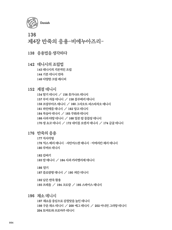 이론을 철저하게 익히고 난 뒤에는 크루아상 반죽을 응용한 30가지 데니시 레시피를 볼 수 있다. 계절 과일을 활용한 제품, 모양을 다양하게 변형한 제품, 채소를 이용한 세이버리 제품, 그리고 남은 반죽을 활용하는 아이디어까지 폭넓게 담아 활용도를 높였다. 마지막으로 크루아상과 함께 비에누아즈리의 대표 제품인 브리오슈에 대한 설명도 추가로 마련했다. 셰프가 큰 대회에서 입상한 제품도 아낌없이 공개힌다.